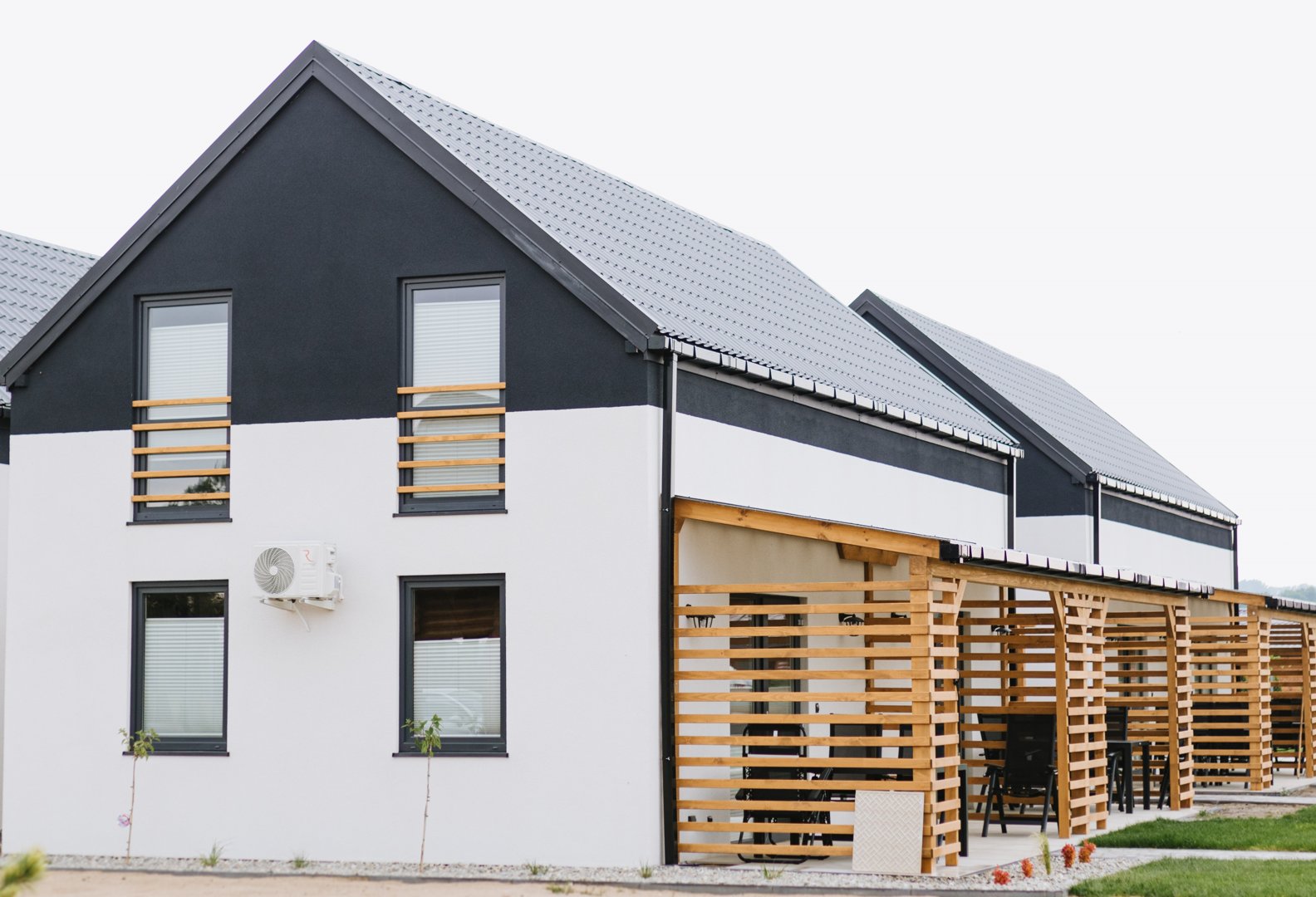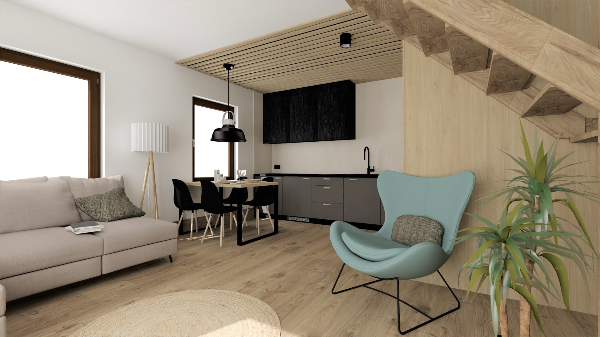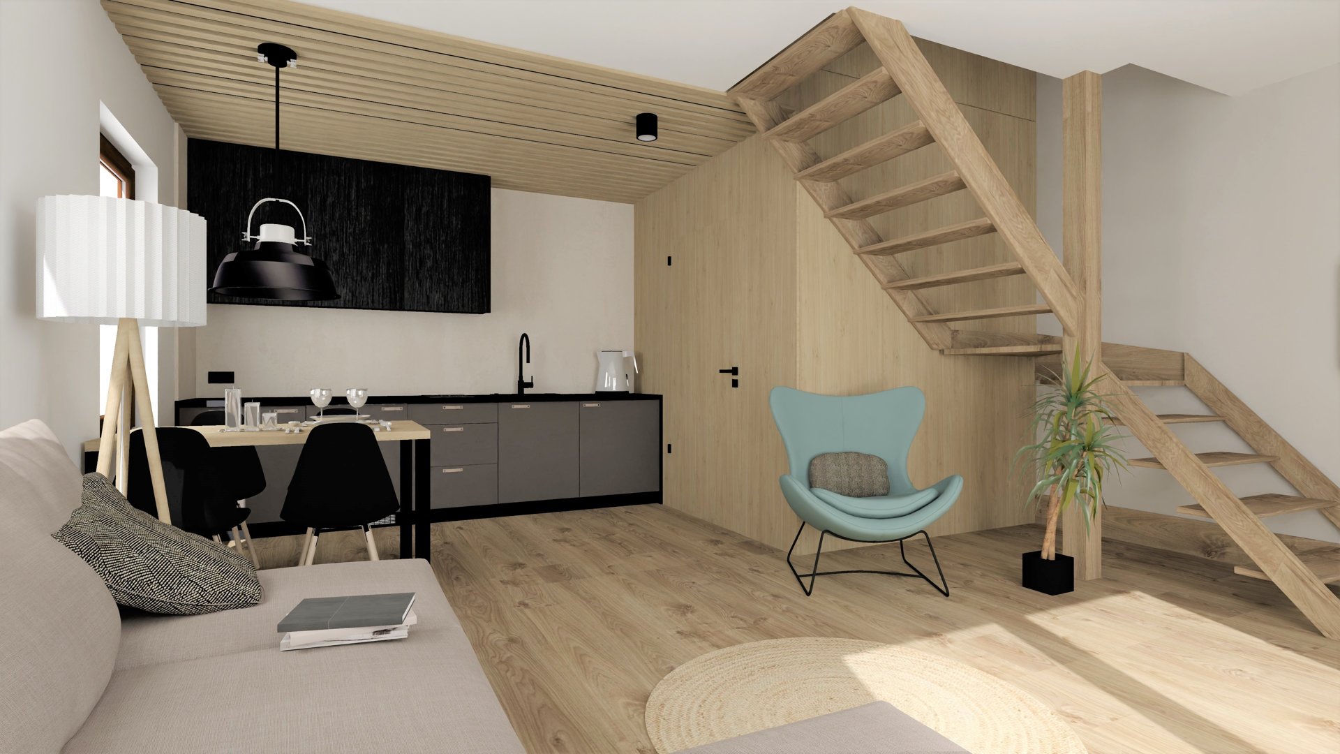 Cottage aus Naturkiefer mit außergewöhnlichen optischen und Gebrauchswerten. Obergeschoss - zwei Schlafzimmer, eine gut ausgestattete Küchenzeile im Erdgeschoss (Kühlschrank, Induktionsherd, Geschirrspüler, Wasserkocher, Besteck, Geschirr, Topf, Pfanne),